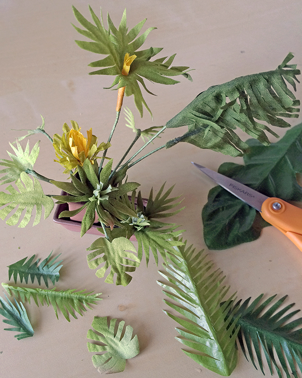 experimenting with palm leaf shapes cut from fabric flower foliage