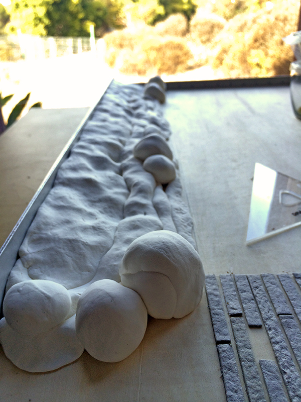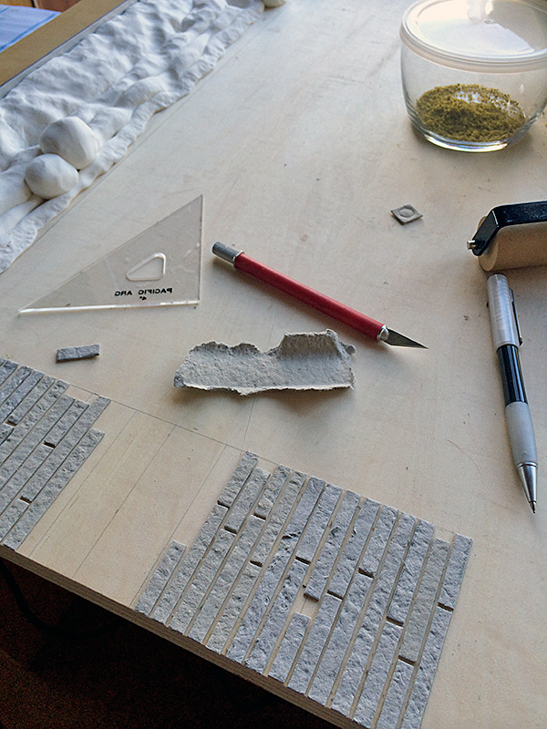 My Quest for True Scale Fidelity is now tempered with weight considerations as well. I used real stones and rocks landscaping my first two builds, and they are beautiful but heavy. This time, I’m using air-dry clay to sculpt both the gentle grade and boulders. I’ve never used it before — it’s kind of like a cross between marshmallow and Silly Putty. (Brian says it shrinks like crazy, so we shall see how it turns out). And how mad are my painting skillz.