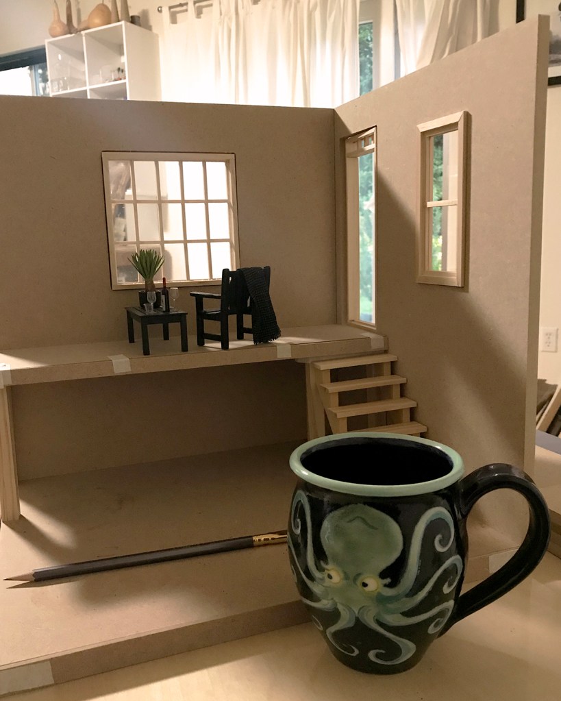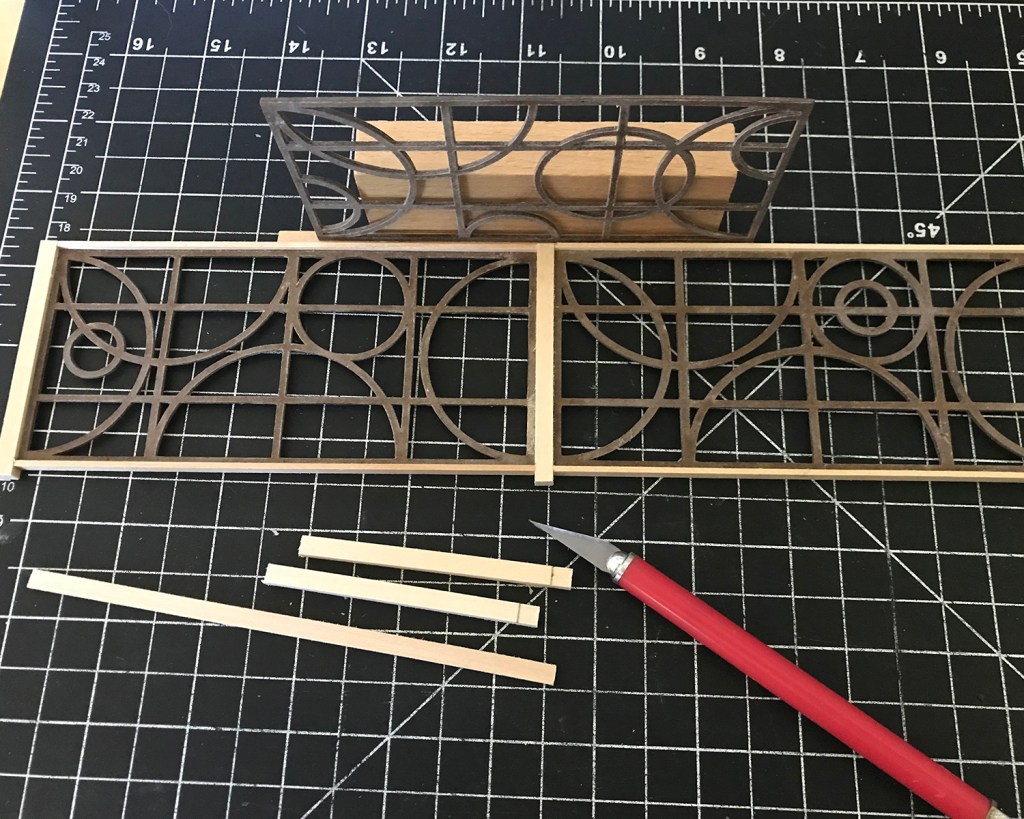 I like a good wide top railing, for cats to lounge, elbows to lean, and drinks to be set upon, so I used 3/4- by 1/8-inch basswood. Thinking now of bracket designs to be cut from card stock to attach the railing securely to the deck, but that’s for tomorrow.