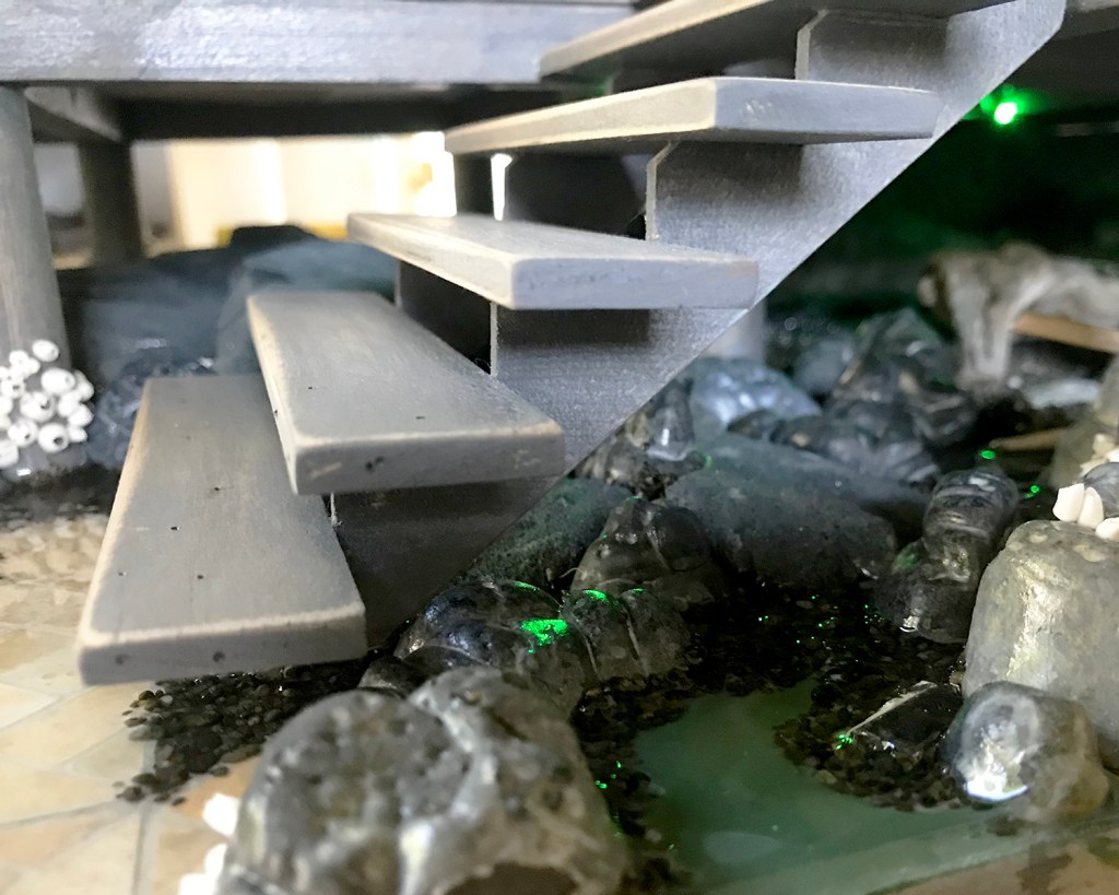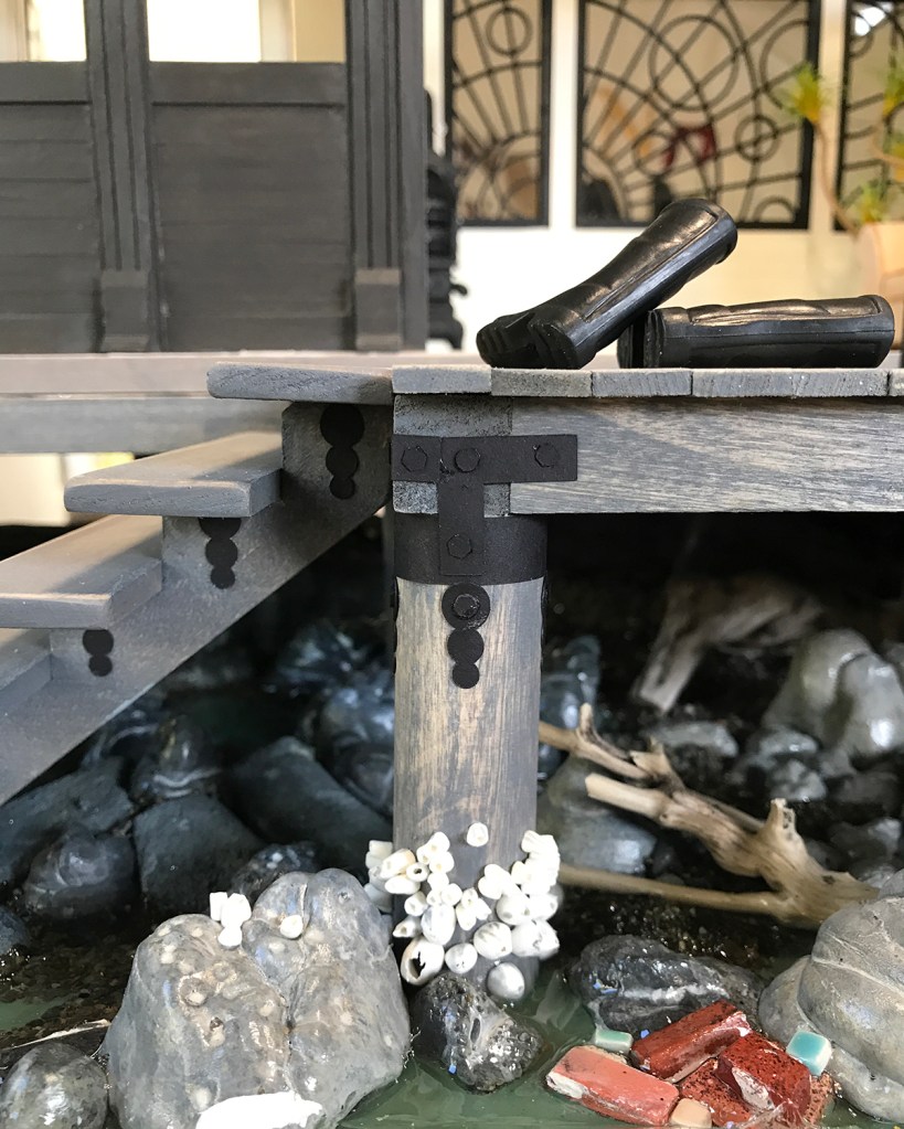 Here’s a glimpse of the under-pier, under-stair Sea House Conservatory setting. Barnacles by Keli, air-dry clay boulders, and flotsam from the natural and manufactured worlds.