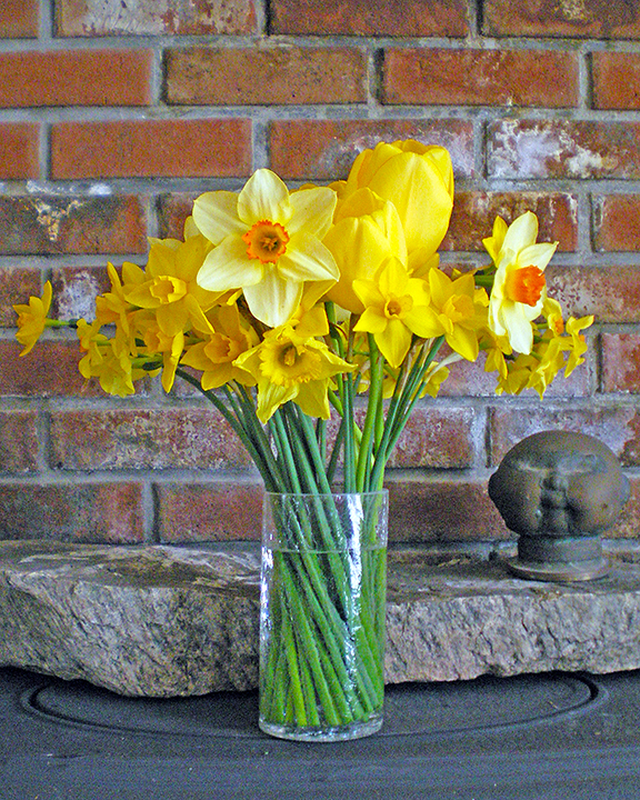 But this is about the daffodils. The flowers are beautiful, worthy enough of focus. And yet, looking at them in the context of an object in a setting, well, I see how important stories are. I see the slab of granite and I remember the walk, the big striped feather we found, the hidden quarry, the sense of adventure and exploration, and the fortitude of my husband carrying back a ridiculously heavy rock because I said I liked it. Mementos. Reminders. Bits and pieces of our lives, kept and displayed, because of the stories they hold.