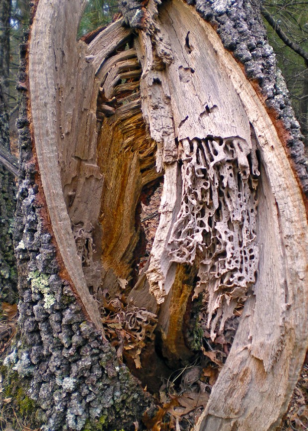 Came across this downed oak on a walk in the woods this afternoon. The hurricane blasted quite a few healthy, innocent bystander trees, but in this one you can see the hidden activity that contributed to its fall. It was beautiful to see, sculptural in its ruin, heart exposed, story told.