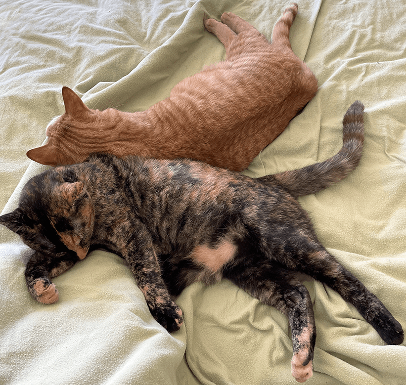 A: They’re 2 years old now and individuated. Meaning orange boy Tater is goofy, food-loving, easy going, and sister Maxine upholds every crazy thing you’ve ever heard about torties. And she parkours.