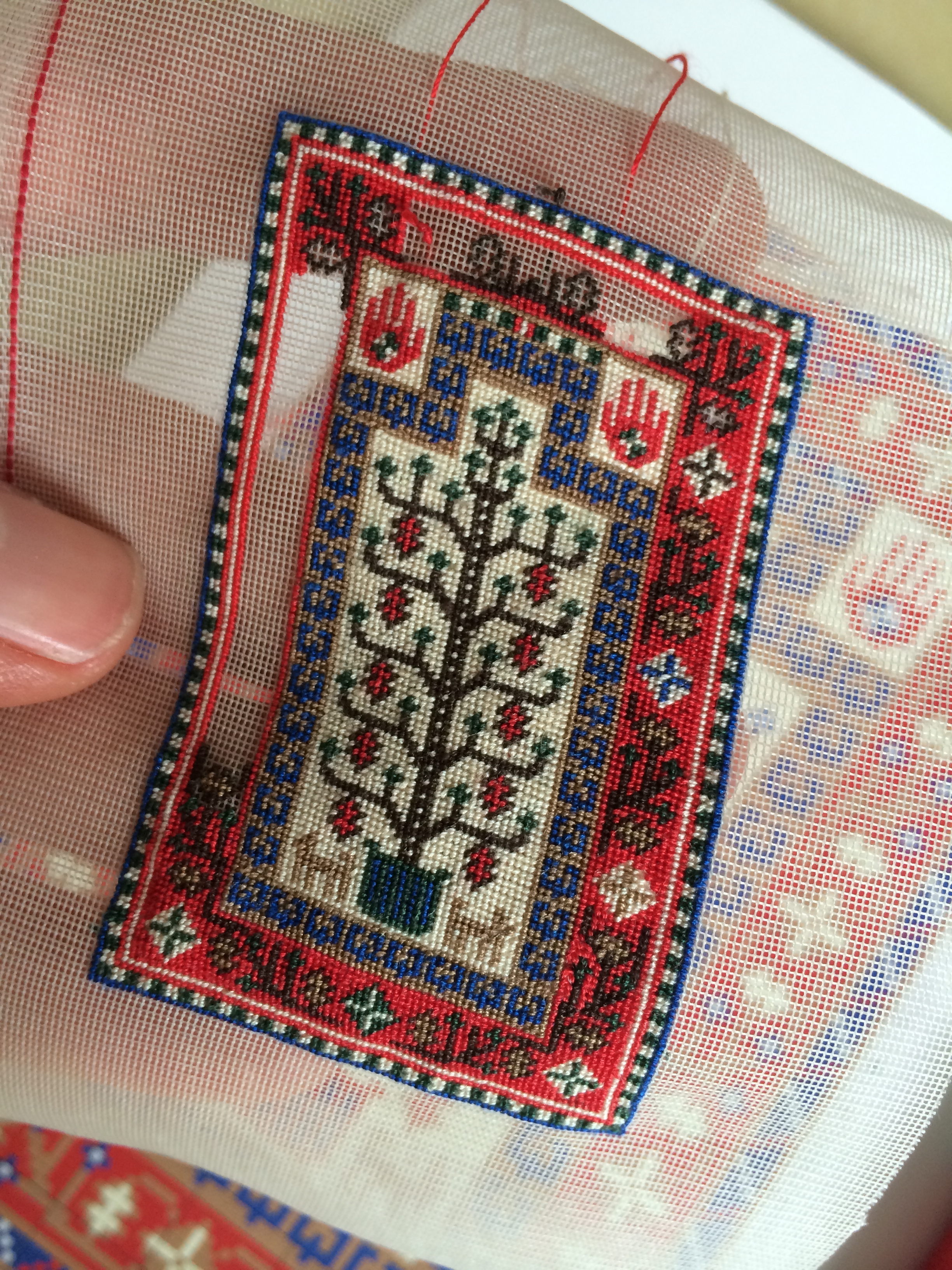 It will be 2.5 x 6 inches (6.35 x 15.25 cm) when done, using Gütermann silk thread. I’m making up the design as I stitch along, although variations of the black and ivory motif will recur. Feels good to be nimbling up my fingers again :)