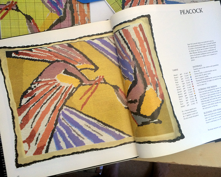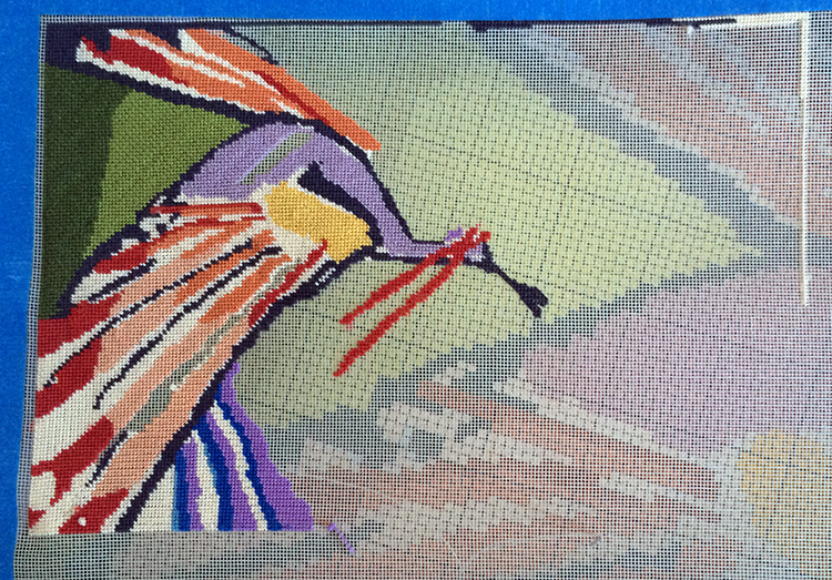Small progress on the Yipes, Stripes rug, at 2.5 x +2.5 inches, it’s a bit more than half finished. It’ll fit well in the showroom. (Stitched on 48-count silk gauze with ten colors of Gütermann silk; making up the design as I stitch :)