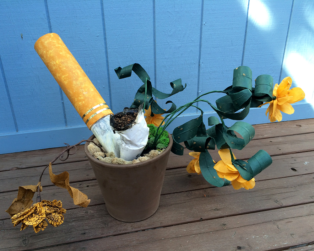 Wait! I don’t want to end this post on such a sad note, so here’s the finished piece again. Isn’t my house a cheerful color? (I didn’t choose it.) I glued bleached moss on the dead side of the pot, and shades of green on the narrow rim that’s still living. Underneath the cigarette is crushed charcoal (and more glue). Note how the living flowers are straining to get away from the big butt. There’s a story here.