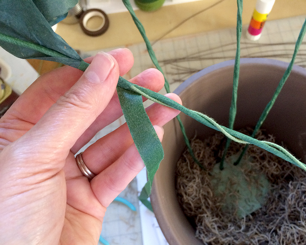 I glued a piece of florist foam to the bottom of the pot, and packed in Spanish moss around it. The flower stems were a little too bendy, so I wrapped another length of 18 gauge around them with florist tape.