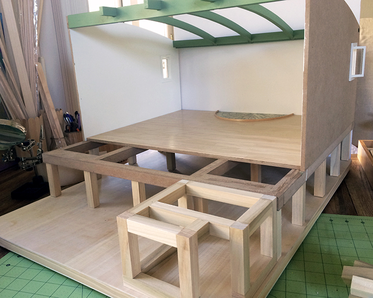 After the glue set, I flipped the hut back over onto the project board, and set the extension foundation in place. Most of the posts will be obscured by the boulders and bedrock of the site, and for now I’m leaving the build loose from the board. I plan to model and mold the boulders with air dry clay, which worked so well — and are so fun to make! — for the Sea House Pavilion. After the clay dries and shrinks in place, which seems to take several days, I’ll glue the posts to the project board.